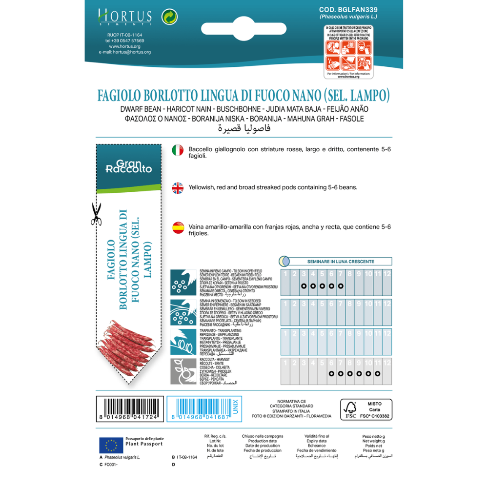 Sow from April-May in well-warmed soil (>15°C) until the end of July, after the risk of night frost has passed, in a sunny, warm location. Sow two seeds every 10 cm, in rows about 50 cm apart. Sowing depth: 3 to 4 cm. For early cultivation, sow indoors and plant out after mid-May. For fresh beans, harvest when the pods begin to yellow. For dried beans, harvest when the pods are completely dry and brown.
